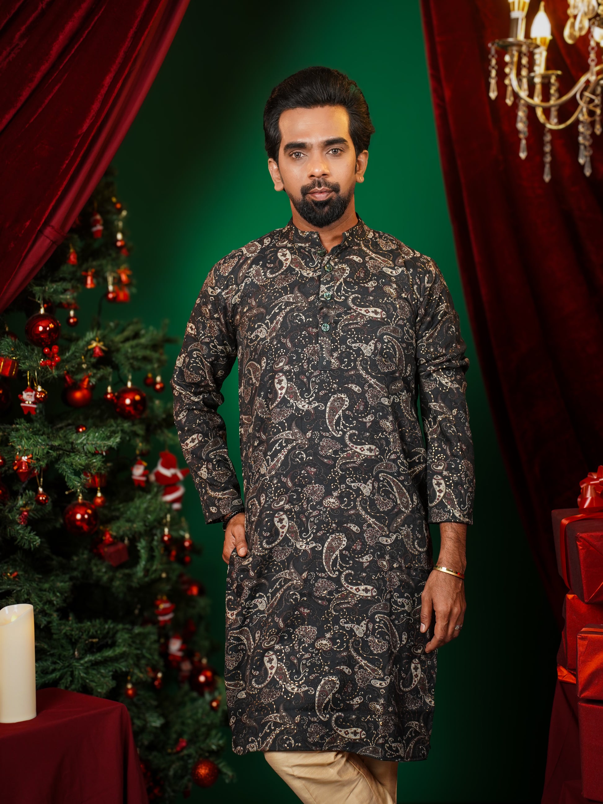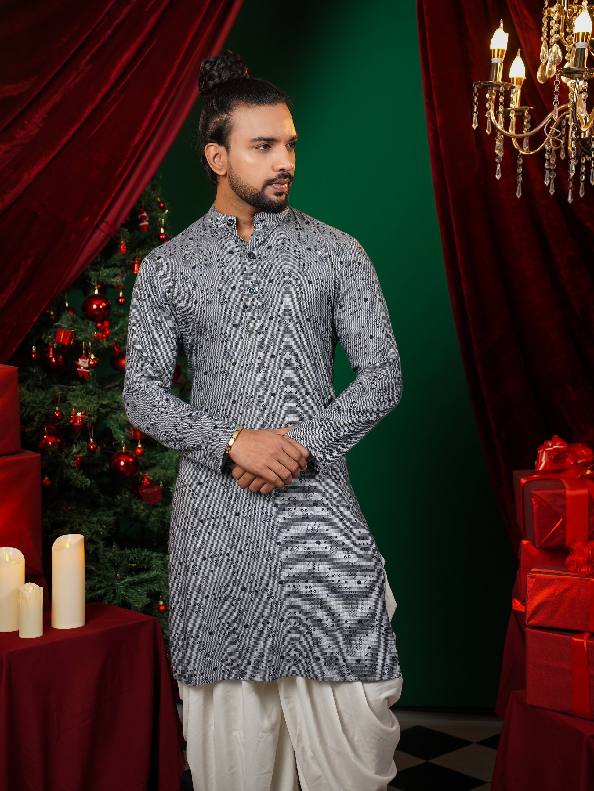 Men’s flowy kurtha paired with contrast dhoti/straight pants.