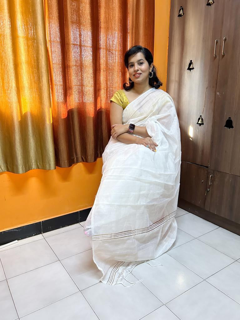 Plain silk cotton saree with thin lines of sequin and zari designs
