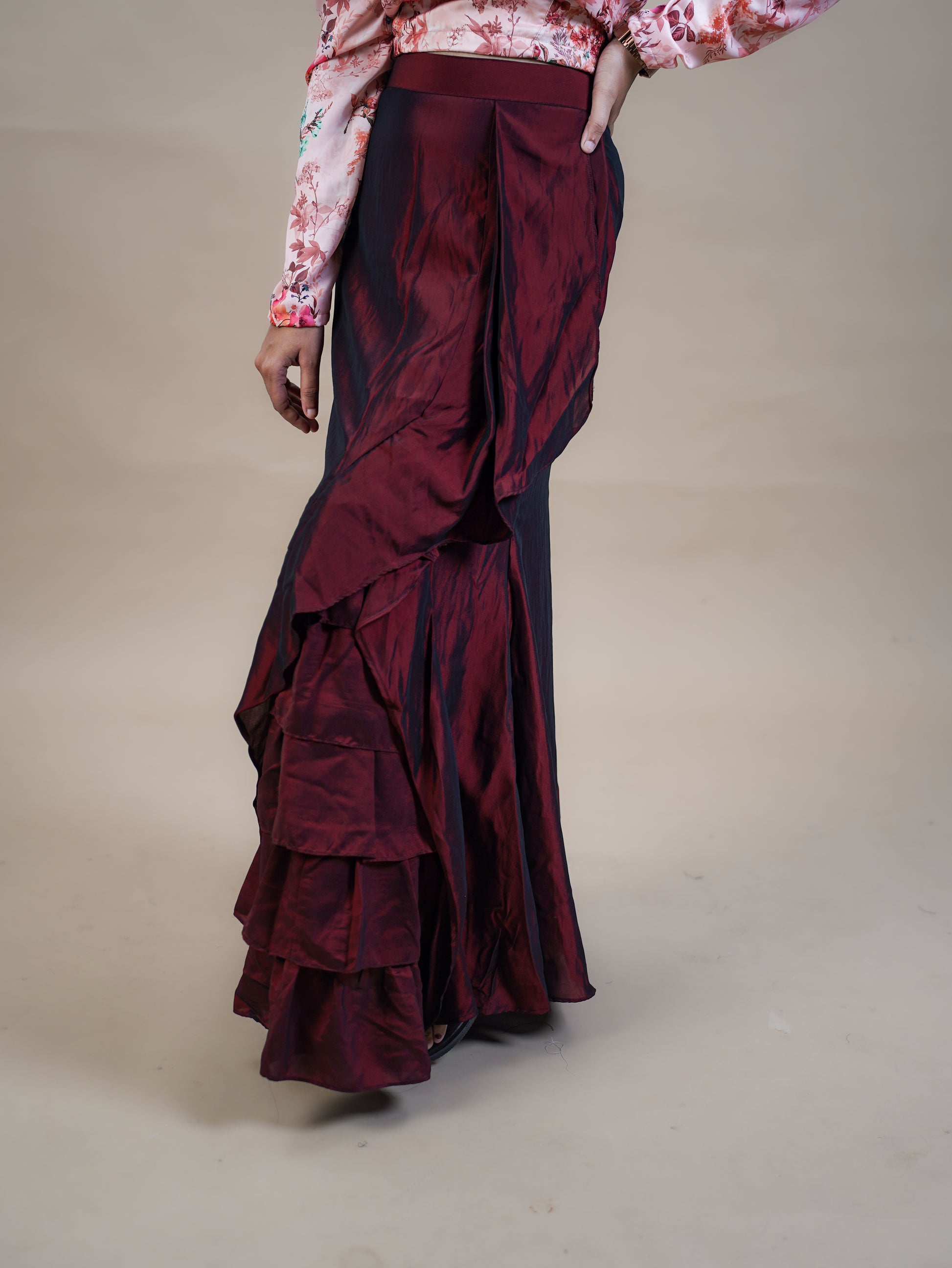 Maroon Ruffle Skirt & Floral Satin Statement Sleeve Top