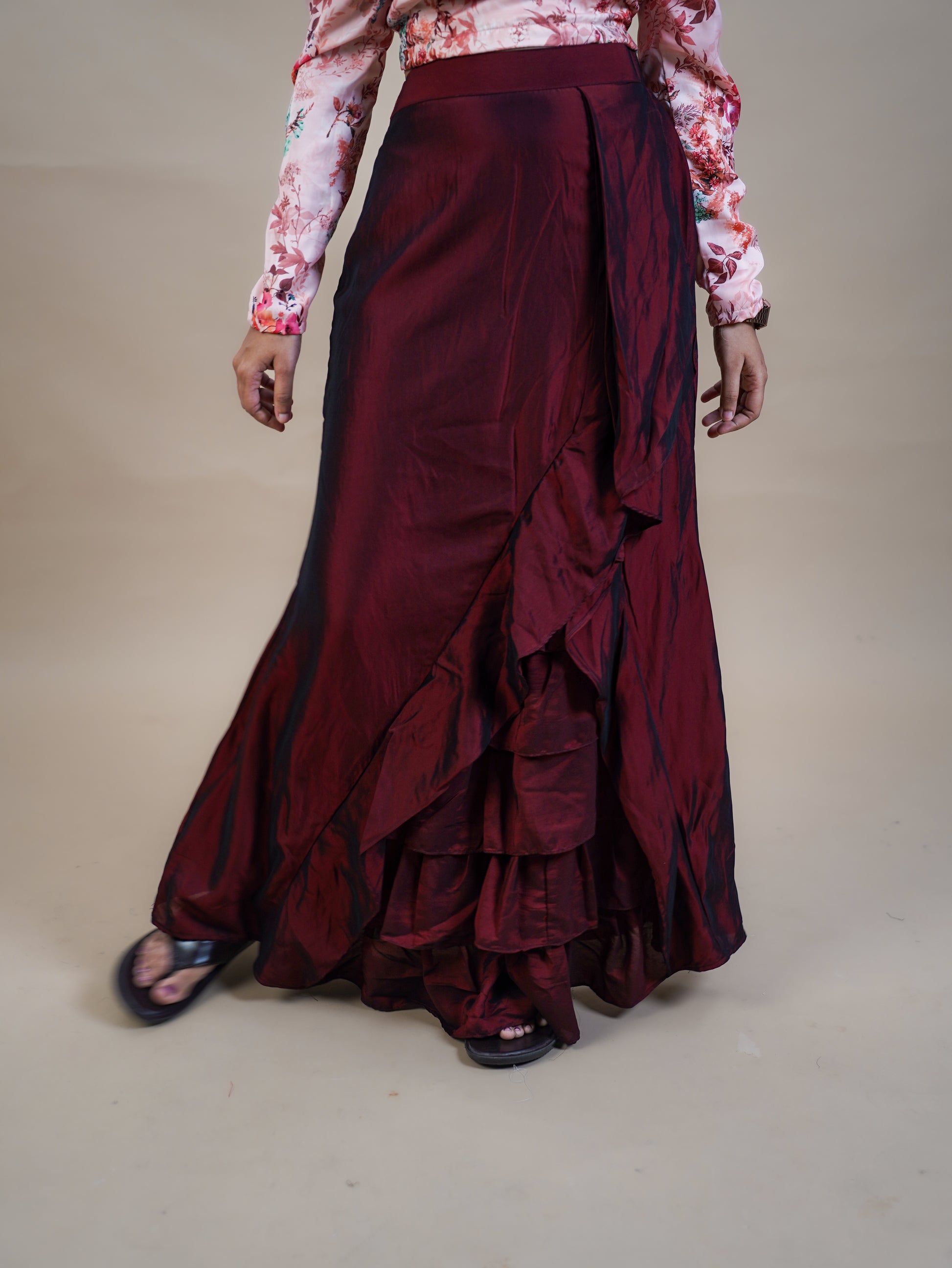 A timeless yet playful ensemble featuring a plain maroon skirt detailed with soft ruffles, paired with a floral satin top designed with elegant statement sleeves. The rich colour and fluid silhouette make it perfect for festive gatherings, casual celebrations, or styled-up day wear.